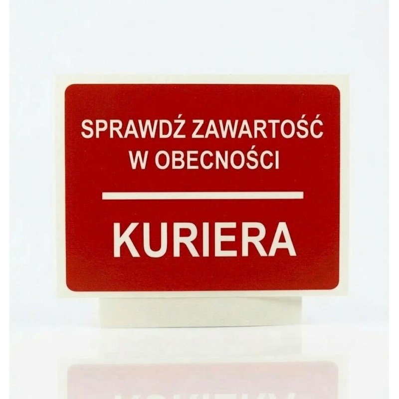 Etykieta logistyczna „SPRAWDŹ ZAWARTOŚĆ W OBECNOŚCI KURIERA”. Kluczowa dla ochrony interesów sprzedawcy i kupującego. Przypomina odbiorcy o konieczności weryfikacji stanu towaru przy odbiorze, co jest niezbędne do spisania protokołu szkody. Wykonana na trwałym papierze z mocnym klejem.